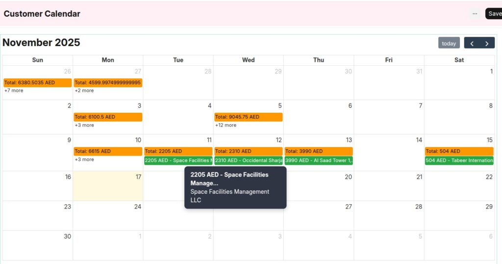 The Customer Calendar in DIGITZ ERP provides a simple, date-based view of all pending customer payments. It visually displays the outstanding amounts on the days they are due, helping the team quickly identify when customer payments are expected.